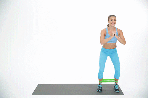 Begin by placing a resistance band around your legs, just above the knees. If you want to increase the difficulty, place the band below your knees, above your ankles.